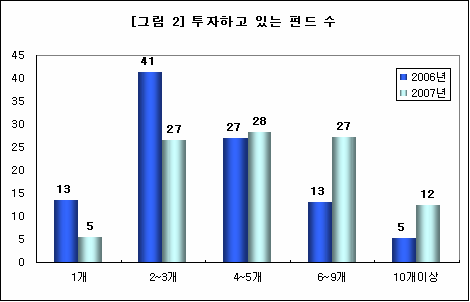 2006년 설문에 응답한 응답자 중 가장 많은 41%가 2~3개 펀드 상품에 투자한다고 답했지만 2007년 조사에 따르면 4~5개 펀드에 투자한다고 답한 투자자가 28%로 가장 높은 비중을 차지했다. 또한 6~9개 상품에 투자한다고 답한 투자자도 전년도 13%에서 27%로 늘어나는 등 전체적으로 투자 상품의 수는 늘어난 것으로 나타났다. 심지어 10개 이상의 펀드에 투자하고 있다고 답한 사람도 12%를 차지해 전년도에 비해 많이 달라진 모습을 보였다.