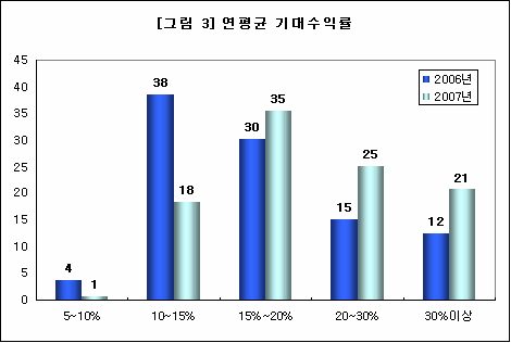 이는 2006년 응답자의 38%가 연 10~15%의 수익률을 기대한다고 답했던 결과에 비해 전체적으로 기대수익률이 높아진 것으로 지난해 연중 일부 중국 등 신흥국 지역 투자 펀드에 투자한 투자자들이 100%가 넘는 수익을 경험하면서 기대수익률이 높아진 것으로 보여진다. 반면 은행금리 수준인 5~10%의 연평균 수익률을 기대한다는 투자자는 직전년도 4%에서 2007년에는 1%까지 줄어들어 대조적인 모습을 보였다.