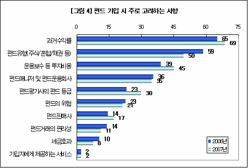 펀드 투자시 고려하는 사항에 대한 응답을 분석한 결과 펀드 투자자의 69%가 과거 수익률을 고려하는 것으로 나타났다. 과거 수익률을 고려하는 비중은 2006년에 비해 더 높아졌으나 펀드의 유형을 고려해 투자한다는 비중은 2006년 59%에서 50%까지 줄었다.