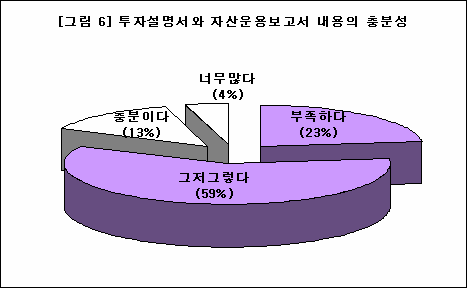설문에 참여한 투자자중 절반이 넘는 54%가 투자설명서와 자산운용보고서가 어렵다고 답했다. 내용에 대한 만족도 역시 총 응답자 중 13%만이 충분하다고 답해 나머지 인원인 80% 이상의 투자자들이 투자설명서나 자산운용 보고서의 내용에 만족하지 못하고 있는 것으로 나타났다.