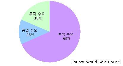 금 시장은 수요 주도 시장(Demand-driven Market)이다. 이는 금 가격이 공급보다는 수요에 의해 훨씬 더 크게 변동한다는 것을 뜻한다. 금에 대한 수요는 크게 보석으로서의 수요, 공업재료로서의 수요, 그리고 투자자산으로서의 수요로 나뉜다. 이중 그림1 에서 볼 수 있듯이 보석수요가 69%로 가장 큰 비중을 차지하고, 투자수요가 18%, 공업수요가 13%로 가장 낮은 비중을 차지한다.
