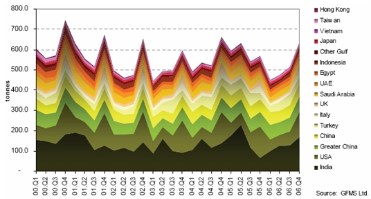 중국의 경우, 초고속 경제성장에도 불구하고 강력한 규제로 인해 금 수요는 상대적으로 침체되어 있었다. 그러나 2002년 이후 지속된 규제 완화로 인해 금 보석시장이 활성화 되면서 앞으로의 수요 증가가 기대된다.