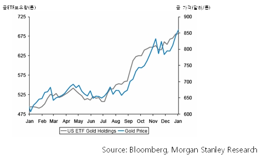 올해 미국 금융시장과 글로벌 금융시장이 불안정한 모습을 보일 것으로 전망되는 가운데 위에서 언급한 금 가격에 긍정적인 환경이 많은 투자자들이 금을 선호 할 것으로 예상된다. 또한 증가하는 수요와 부정적인 공급전망에 따라 펀더멘탈이 받쳐주고 있어 금 가격의 상승세가 이어질 것으로 본다. 그러나 최근의 급등에 따른 가격 부담으로 전년과 같은 상승폭은 힘들 것으로 전망된다. 또한 미국 경기 회복, 달러 가치 상승과 예상치 못한 환경적인 요인들 발생시 안정자산인 금의 상승에 어려움을 줄 것으로 보인다.