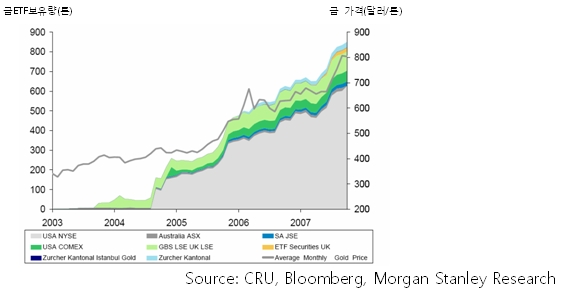 최근 금 가격의 상승은 투자자산으로서의 수요가 주도했다. 투자자산 중에서도 가장 빠르게 증가하고 있는 금 ETF가 주된 원동력이다. 금ETF의 금 보유량은 2007년 251톤이나 증가했다.