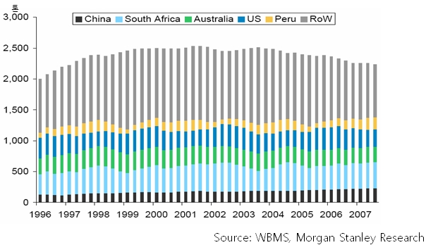 인도네시아는 Grasberg 광산에서의 생산을 늘리면서 생산량을 2007년 전년대비 18%나 증가시켰다.그러나 이러한 큰 폭의 증가는 일시적인 것으로 보이고 2008년에는 10% 대의 안정된 증가를 보일 것으로 전망된다.