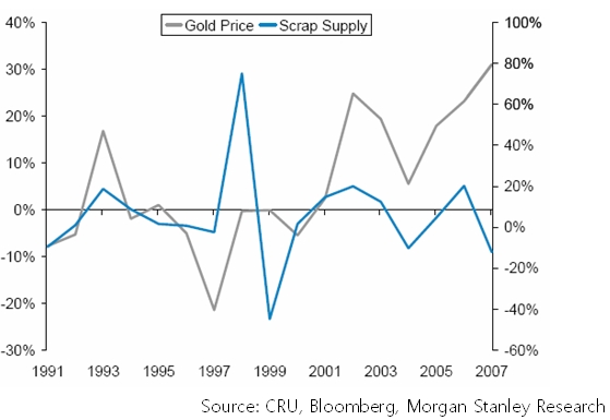 재활용 금의 공급은 경제 상황과 가격에 직접적인 영향을 받는다. 과거 데이터를 보면 금의 가격 상승이 재활용 금의 공급을 증가시키는 것을 볼 수 있다. 1998년의 갑작스러운 증가는 한국의 금 모으기 운동으로 인한 것이다.