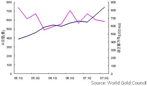 • 환경적인 요인들: 고유가, 달러약세, 미국 경기 침체로 대안 투자처로 금 수요 증가
