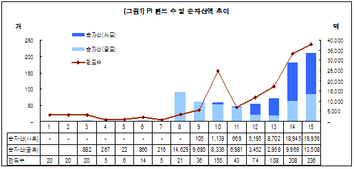 누적수익률을 연단위로 환산한 결과는 단순수익률과 다소 차이가 있었다. 5~10%의 수익을 기록한 펀드수가 소폭 감소하면서 10~20%의 비중이 증가해 단순 누적수익률분포보다 개선된 결과로 나타났다. 이는 설정에서 상환까지 소요된 기간이 1년 미만인 펀드들 때문인 것으로 보인다. 사모펀드의 경우는 단순 누적수익률보다 연환산했을 때 10~20% 수익률 비중이 크게 증가함을 볼 수 있다.
