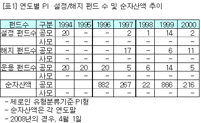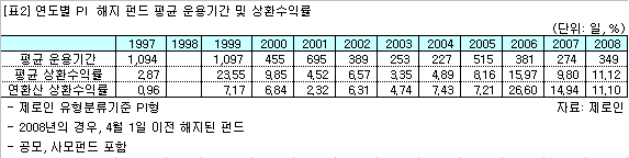 [표2]는 연도별 해지펀드의 운용기간 및 상환수익률을 단순 평균한 값이다. 1990년대나 2000년대 초기에 설정된 PI 펀드들의 운용기간은 긴 편이나, 2002년 이후로는 평균적으로 1년 전후의 운용기간을 갖는 것으로 나타났다. 연환산된 상환수익률을 살펴보면, 2003년 4.74%였던 수익률이 2006년까지 주식시장 상승과 맞물리면서 상환수익률이 상승하고 있음을 볼 수 있다. 주가가 상승국면에 있을 때 보험형 펀드도 그 상승 혜택을 누리고 있음을 보여주는 대목이다. 그러나 보험형 펀드는 1년 전후인 운용기간 특성 때문에 주가가 약세를 보였던 지난 2000년도와 2002년도의 영향을 받아 그 이듬해인 2001년, 2003년 상환 수익률이 이자율을 밑도는 부진을 보였다. 평균적으로는 보험형의 맡은 바 소임을 다했다고 볼 수 있다.