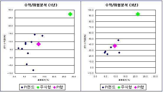 2008년 4월 1일 기준으로, 01년과 3년 수익과 위험을 분석해 보았다. 아래는 해당기간에 운용중인 PI펀드와 일반 주식형, PI형의 수익률 및 변동성(표준편차)를 비교해 본 결과이다.