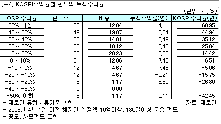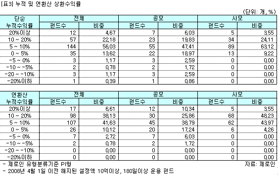 해지된 펀드 중 상환당시 설정액 10억이상, 운용기간 180일 이상인 펀드들을 대상으로 누적수익률 분포를 측정한 결과, 전체 257개 펀드 중 절반이 넘는 144개(56.03%) 펀드가 5~10%의 단순 누적수익률을 기록했다. 다음으로는 57개(22.18%)가 10~20%, 35개(13.62%)가 0~5%의 수익을 냈다. 마이너스 수익을 보인 펀드도 9개나 됐고, 5%미만의 수익을 손실로 본다면(무위험수익률을 5%라 가정시) 44개 펀드, 17%가 손실을 본 것으로 나타났다.