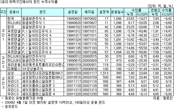 [표5]는 해당 하락구간에서 해지된 펀드들이다. KOSPI 지수가 10%이상 큰 폭으로 하락한 경우에는 PI형 역시 마이너스 수익률을 보이고 있고, 플러스 성과를 보이는 펀드들도 무위험 수익률을 5%정도로 가정하면, 5개 펀드를 제외하고는 모두 손실을 봤다고 할 수 있겠다.