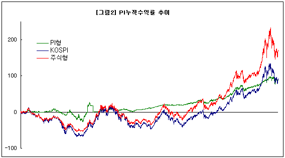 PI펀드가 약세시장에서는 보유한 주식의 가치가 투자자가 설정한 손실방어선 밑으로 하락하지 않도록 하면서 강세국면에서는 주가 상승이익의 일정부분을 얻도록 설계된 펀드이기 때문이다. 하지만, PI형 역시 주식에 투자하고 있기 때문에 주식시장이 하락하면 손실을 볼 수도 있다는 것을 알 수 있다. 물론 타겟으로 한 보험형 구조의 실현은 상환수익률을 봐야만 알 수 있다.
