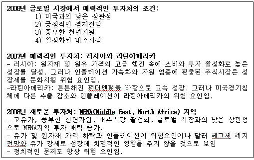 유가와 원자재 강세, 달러화 약세가 지속된다는 가정하에 러시아와 라틴아메리카의 투자 환경을 살펴보고, 새롭게 주목 받고 있는 MENA(Middle East, North Africa) 지역을 대체 투자처로 소개하고자 한다.