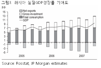러시아 실질GDP성장률의 항목별 기여도를 보면 러시아 경제 성장의 원동력 소비와 투자에 있는 것을 볼 수 있다. 또한 2007년 하반기부터 급격하게 오 른 원자재 및 원유도 성장에 기여를 했다.
