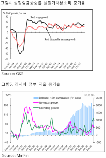 가구소비는 연평균 13.1% 상승했고 고정자본 투자도 20.6% 상승하면서 원자 재 및 원유 가격 급등에 따른 수입이 투자와 소비로 잘 이어지는 모습을 보 였다. 러시아 통계당국이 추정한 바에 의하면 러시아의 경상수지와 재정수지 의 균형 수준 분기점은 WTI유가 기준으로 50~60 달러 수준으로 예상된다. 따 라서 118.52달러/배럴(4월 25일 기준) 를 기록하고 있는 2008년 원유 가격의 고공 행진에 따른 이익은 지속 될 것으로 보인다. 또한 러시아의 재정흑자로 새로 들어선 정부의 인프라투자 계획이 시행될 것으로 보여지고 루블화 가치 상승과 임금 증가에 따른 소비 증가도 기대되면서 2008년에도 러시아 경제는 성장세를 유지할 것으로 판단된다.