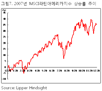 러시아와 함께 라틴아메리카 지역 주식시장은 2007년 최고의 상승률을 기록했다. 라틴아메리카의 주요국인 브라질 Bovespa의 2007년 상승률은 43.65%에 달했다. 메릴린치에 따르면 2007년 이 지역 GDP성장률은 5.5%를 기록, 과거와 달리 미국 경제와의 디커플링에 성공하는 모습을 보여줬다.