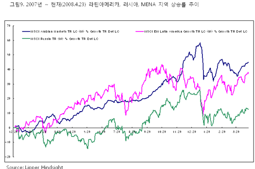 2008년 세계 주식시장은 2007년 시작된 미국 신용 경색 사태를 시작으로 현재까지 불안정한 모습을 보여주고 있다. 그 동안 높은 수익을 올리던 이머징 마켓 펀드들도 신용경색 사태 후 고전을 면치 못하고 있다. 특히 선풍적 인기를 끌었던 중국펀드들은 올 들어 수익률 순위에서 흔적도 없이 사라졌다. 투자자들은 대체투자처로서 상품, 원자재, 원유, 금과 같은 실물자산 쪽으로 시선을 돌렸다. 이에 자원이 풍부한 라틴아메리카와 러시아 등이 글로벌 악재에도 불구하고 비교적 탄탄한 상승 추세를 유지했다.