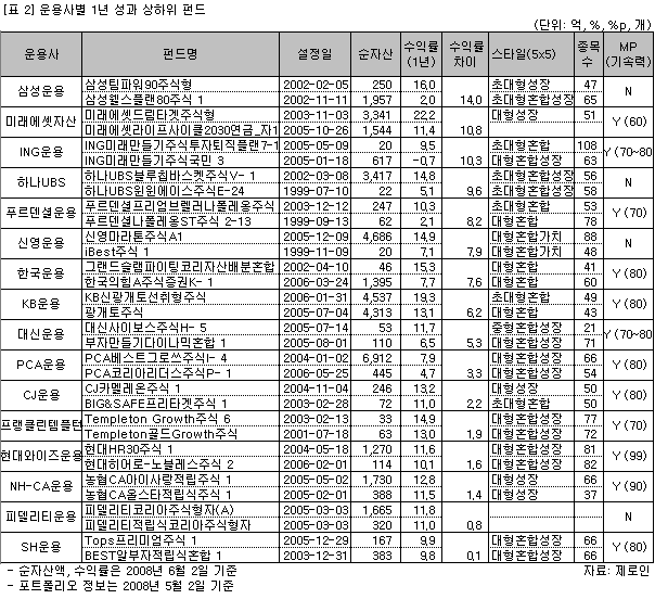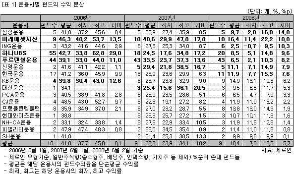 2008년 6월 2일 기준으로 수익률간의 차이가 가장 큰 운용사는 삼성운용으로 최고와 최저 수익률이 각각 16.0%와 2.0%로 펀드간 수익률 편차가 14.0%포인트를 기록했다. 다음으로, 미래에셋자산, ING운용, 하나UBS 순으로 펀드간 수익률 차이가 크게 나타났다. 특히, 삼성운용, 미래에셋자산, ING운용의 최고 수익률과 최저 수익률의 차이는 10%포인트가 넘었다.