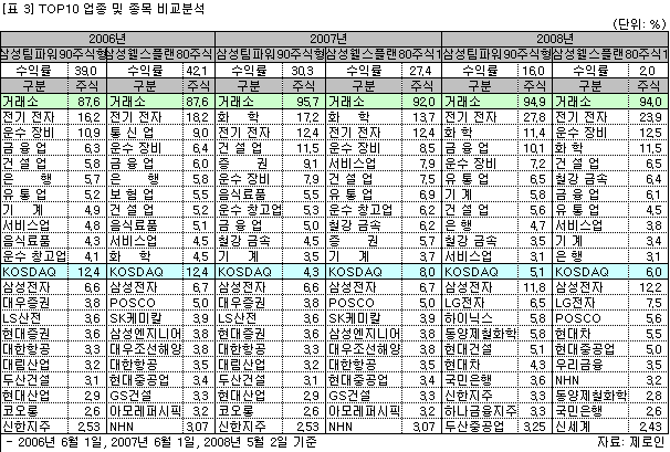 업종별로는 금융과 전기전자의 비중이 ‘삼성팀파워90주식형’ 펀드는 10.1%, 27.8%, ‘삼성웰스플랜80주식 1’ 펀드는 6.1%, 23.9%로 나타나 각각 4.0%포인트씩 차이가 났고, TOP10 종목 중 삼성전자, LG전자, 동양제철화학, 현대차, 국민은행, 5개 종목만 일치하고 절반에 해당하는 5개는 서로 다른 종목으로 구성되어 있다.
