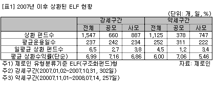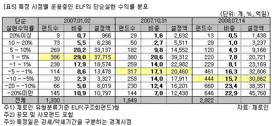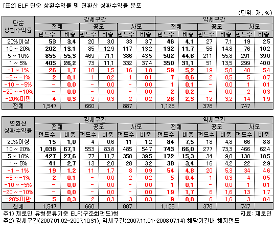 강세와 약세 기간 동안 ELF가 어떤 모습을 보였는지를 살펴보기 위해 2개 구간의 상환수익률을 조사했다. 강세구간은 2007년초부터 10월말까지 302일간, 약세구간은 2007년11월1일부터 올해 7월14일까지 257일간이다.