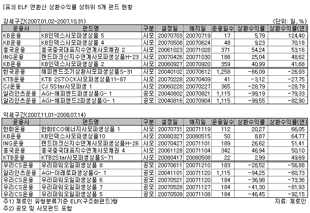 강세구간 7%, 약세구간 6%인 ELF의 평균상환 수익률은 상당히 매력적이다. 그러나 펀드 별 상환수익률을 살펴보면 어떤 경우는 일반주식펀드 이상으로 위험한 상품이 될 수 있다는 것을 쉽게 알 수 있다. [표5]는 강세 및 약세구간 때 상환된 펀드들 중 상하위 수익률(공사모 구분없음) 5개씩을 나열한 것이다.