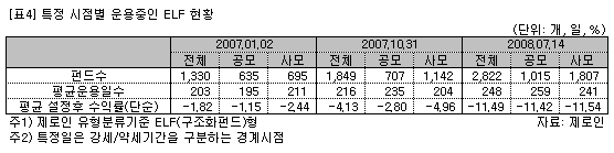 지난 2001년말 5개에 불과했던 ELF의 수는 주가가 정점을 이루었던 2007년 10월말 1,849개(설정액 15조2천억원)에서 지난 7월14일 2,822개(20조5천518억원)로 주가가 약세로 돌아선 이후에도 여전히 번창하고 있다.