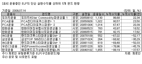 [표6]는 지난 7월14일 현재 운용중인 수익률 상하위 5개 펀드들이다. 공모와 사모를 구분하지 않고, 단순 누적수익률 상위 5개 펀드와 하위 5개 펀드들이다.