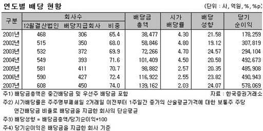 4월 한국증권거래소에서 발표한 자료에 따르면 정기주주총회 실시 대상인 12월 결산법인 608개사 중 현금배당을 실시하는 450개사를 대상으로 배당 현황 집계를 분석한 결과 2007년 당기순이익과 배당금 총액은 전년 대비 각각 17.75%, 19.02% 증가한 57조 8,069억원, 13조 9,162억원으로 집계됐다. 기업의 당기순익 가운데 주주에게 돌아가는 배당금 비율을 나타내는 배당성향은 24.07%로 2003년 24.57% 이후 가장 높은 수준을 나타냈다. 또한 배당금을 지급한 회사들의 시가배당률(배당기준일 주가에 대한 배당금액)은 주가 상승으로 전년대비 0.52%포인트 하락한 2.03%를 기록했다.
