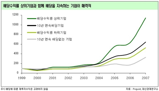 대신경제연구소에서 시가배당률에 따른 성과분석 한 결과 시가배당률이 높고 배당성향이 안정된 기업의 수익률이 좋은 것으로 나타났다. 대신경제연구소는 이 분석을 위해 거래소 기업 중 시가총액 300위 기업을 대상으로 시가배당률(배당수익률) 상위(25%)기업, 시가배당률(배당수익률) 하위(25%)기업, 10년 연속 배당을 지속한 기업, 10년 연속 배당을 하지 않은 기업으로 구분해 1999년 12월 말부터 2007년 9월 21일까지 성과를 측정했다. 그 결과 시가배당률 상위기업이 가장 높은 성과를 나타냈으며 10년 동안 배당이 없던 그룹이 가장 낮은 성과를 보였다. 시가배당률 상위기업 주식의 경우 주가 상승률도 높게 나타나고 있는데 이는 고배당주식은 현금창출능력, 기업투명성 및 소액주주 보호 등 주가에 호의적 변수가 함께 존재하기 때문이다. 또한 10년 연속 배당을 지속한 기업들의 성과가 두 번째로 높게 나타났는데 이는 10년 연속 배당을 지속했다는 것은 꾸준히 이익을 창출하는 기업으로 투자자들이 생각하는 우량기업의 기준에 해당된다고 할 수 있기 때문이다.