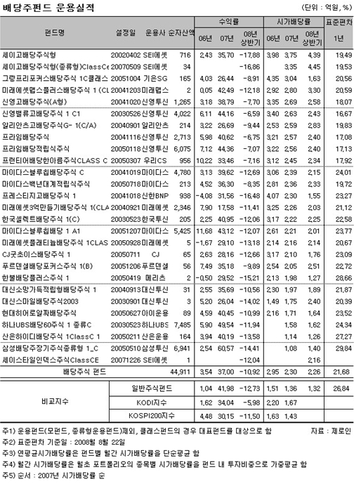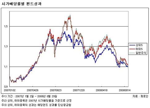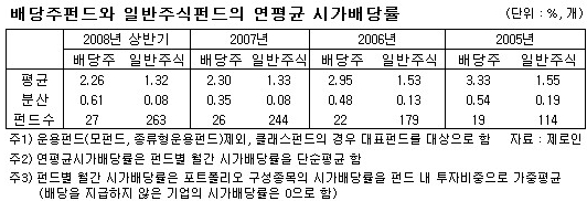 배당주펀드로서 시가배당률이 낮은 펀드들의 성과추이를 살펴보기 위해 2007년간 평균 시가배당률이 높은 5개의 펀드와 낮은 5개의 펀드, 일반주식과 배당주펀드의 유형평균 수익률을 2007년 1월부터 2008년 8월까지 비교한 결과 시가배당률이 낮은 그룹의 성과가 일반주식펀드의 유형평균과 거의 일치하는 모습을 보이고 있다.