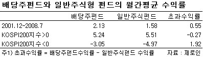 2001년 12월부터 2008년 7월까지의 제로인 유형분류기준으로 일반주식펀드와 배당주펀드의 월간 유형평균 수익률을 조사한 결과 배당주펀드가 일반주식펀드에 비해 1%포인트 가량 높은 수익률을 나타냈다.