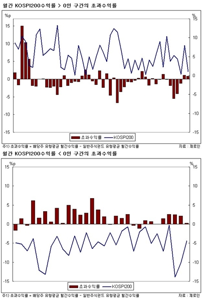 또한 같은 기간 코스피200지수의 월간 수익률이 상승(+)한 구간과 하락(-)한 구간에서의 차이를 비교한 결과 상승구간에서는 일반주식펀드가 0.27% 더 우수한 수익률을 나타냈고, 하락구간에서는 배당주 펀드의 성과가 2%포인트 높은 수익률로 하락률을 방어하는 모습을 보였다. 특히 이 기간에서는 5달을 제외하고 모두 배당주펀드가 일반주식펀드에 비해 초과수익을 거두며 하락장에서 안정된 모습을 보이고 있다.