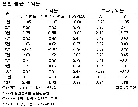 또한 배당주의 계절적 요인에 의한 수익률 상승이 배당주 펀드의 수익률에 영향을 미치는지 살펴봤다.