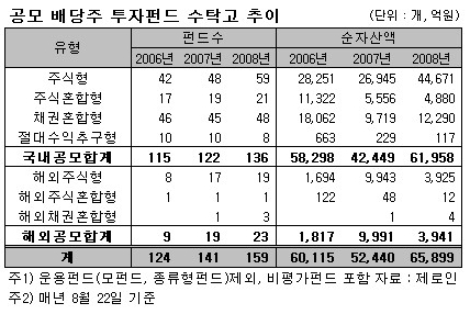 2008년 8월 22일 현재 배당주에 투자하는 펀드의 총순자산액은 6조 5,899억원에 달한다. 공모 국내주식형펀드의 경우 전년대비 11개 펀드가 신규로 설정되며 1조 7,726억원이 더 늘었다. 이중 8개의 펀드가 국내증시 조정장이었던 2007년 11월 이후 설정됐다. 공모해외주식형펀드의 경우 2007년 유럽배당주펀드를 중심으로 9개의 펀드들이 설정됐다. 하지만 2007년 이후 대부분의 펀드에서 자금이 빠져나가며 현재 3,925억원의 순자산액을 보이고 있다.