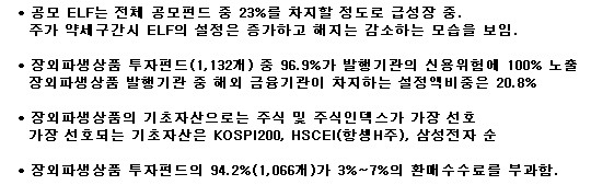 그러나 리먼브러더스 사태로 인해 발행기관 신용위험이 ELF 투자자에게 확산되면서, 연초후 하락장에서 ELF 투자에 열을 올린 투자자의 고민을 한층 더 깊게 만들고 있다. 장외파생상품 거래에서 항상 존재하는 발행기관 신용위험은 ELF만의 문제가 아니다. 일부 글로벌PI, 글로벌헤지전략 펀드에도 이러한 문제는 존재한다. 이에 장외파생상품의 위험에 항상 노출될 수 밖에 없는 ELF의 현황 및 장외파생상품을 편입한 펀드들의 위험 및 현황을 짚어보고자 한다. 다만, 자료수집의 한계로 인해 공모펀드만으로 분석했다.