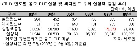 2003년부터 본격적으로 만들어지기 시작한 ELF는 2003년말 3조 1,944억원이던 설정액 잔고가 2008년 9월 16일 현재 10조 8,022억원까지 커질 정도로 매년 성장을 거듭하고 있다. 또한 2005년부터는 매년 750개 이상의 펀드가 신규로 만들어지고 있는 실정이니 2008년 8월말 기준으로 전체 공모펀드(4,789개) 중 약 23%(1,123개)가 ELF라는 것도 별로 놀라운 일은 아니다. 다만 2007년에 ELF 설정액이 5,373억원 감소한 것은 주가가 상승함에 따라 기존 ELF들이 조기 상환되고, 투자자들이 ELF외에 해외 및 국내 주식형 펀드에 몰렸기 때문으로 보인다.