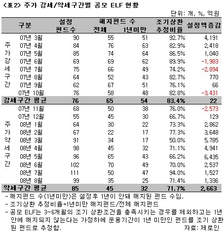 그러나 그 속을 가만히 들여다보면, 2007년과 2008년에 급격한 변화가 있었음을 알 수 있다. 보다 세부적으로 살펴보기 위해 2007년과 2008년을 주가 강세구간(2007년 3월~2007년 10월)과 약세구간(2007년 11월~2008년 8월)으로 구분해 살펴봤다. KOSPI가 1,400포인트를 바닥으로 2,063포인트까지 상승했던 주가 강세구간 중에는 월평균 76개의 펀드가 설정되고 65개의 펀드가 해지된 것으로 나타났다. 이 중 운용기간이 1년미만인 펀드들을 가지고 추정한 조기상환비율은 월평균 83.4%로 나타났다. 반면 약세구간에서는 신규 설정펀드 수(월평균 85개)는 증가하고 해지펀드 수(월평균 45개)는 감소했다. 설정후 1년이 안된 펀드가 해지되는 비율은 71.7%로 나타났다. 즉, 주가가 약세구간에 진입해 있을 때 신규설정되는 펀드 수는 증가하고 해지펀드 수는 감소한 것이다. 특히 조기상환 된 것으로 추정되는 운용기간 1년미만 해지펀드 수는 비교적 큰 폭으로 감소했다. 이는 기존에 만들어진 상품의 대부분이 기초자산의 가격이 상승하거나 일정 수준 이상인 경우 조기 상환되는 상품인 만큼 주가가 약세인 이 시기 동안에는 기초자산의 가격이 약세를 보임에 따라 조기 상환조건을 충족시키기가 어려웠기 때문이다.