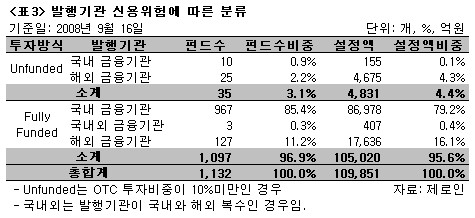 발행기관 신용위험에 따른 분류(<표3>)에 따르면, 2008년 9월 16일 기준으로 장외파생상품 발행기관의 신용위험에 노출된 공모펀드 유형은 ELF, 글로벌PI, 글로벌헤지전략 등 3개 유형에 걸쳐 1,132개 펀드(설정액 10조 9,851억원)인 것으로 파악됐다. 이를 발행기관의 위험에 90%이상 노출된 경우(Fully Funded) 와 아닌 경우(Unfunded)로 나눠서 살펴봤다. 즉, 리먼브러더스의 파산보호신청과 같은 신용위험 관련 사건이 발생했을 경우 펀드 투자자가 거의 100% 손해를 입는 경우와 아닌 경우로 구분했다. 장외파생상품 투자비중이 10%미만인 경우(Unfunded)는 35개 펀드, 설정액 4,831억원, 설정액비중으로는 단지 4.4%에 불과했다. 요즘 이슈화되고 있는 해외 금융기관의 신용위험에 상당부분 노출된 경우(Fully Funded)는 총 130개 펀드, 1조 8,043억원에 달하는 것으로 나타났다. 또한, 발행기관을 국내, 해외, 국내외로 구분해 해외 금융기관의 신용위기가 얼마나 국내 펀드투자자들에게 직접적인 영향을 미칠 수 있는지를 조사해 봤다. 국내 발행기관의 신용위기시 직접적인 영향을 받는 펀드는 전체의 87%인 980개(설정액 8조 7,540억원)에 달했다. 반면 해외 발행기관의 신용위기시 직접적인 피해를 볼 가능성이 있는 펀드는 155개(설정액 2조 2,718억원)로 나타났다. 그 중 원금의 대부분이 손실로 이어질 가능성이 있는 펀드는 127개(설정액 1조 7,636억원)였다.