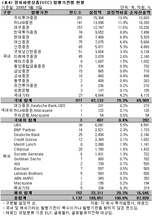 장외파생상품(OTC) 발행기관별 현황(<표4>)에 따르면, 국내 발행기관이 차지하는 비중이 설정액 10조 9,851억원 중 79.3%, 해외 발행기관이 차지하는 비중은 20.3%로 나타났다. 국내 발행기관은 우리투자증권(13.9%), 하나IB증권(11.9%), 대우증권(11.6%), 한국투자증권(8.8%), 현대증권(6.8%) 등이 주요 발행기관이었으며, 상위 5개사에 장외파생상품 투자 펀드 전체 설정액의 약 53%가 집중돼 있었다. 리먼브러더스 사태로 관심의 대상이 되고 있는 해외 금융기관 중에는 UBS(5.5%), BNP Paribas(2.3%), Deutsche Bank(2.3%), Credit Suisse(2.1%), Merrill Lynch(1.9%) 등이 주요 발행기관이었다. 또한 전체 펀드 설정액의 99.3%, 1,123개에 달하는 펀드가 단일 발행기관과 장외파생상품 계약관계를 맺고 있었다. 이는 거래관계에 있는 금융기관의 신용위험 증가(최악의 경우 파산)시 위험이 고스란히 펀드투자자에게 전가될 수 밖에 없는 구조다.