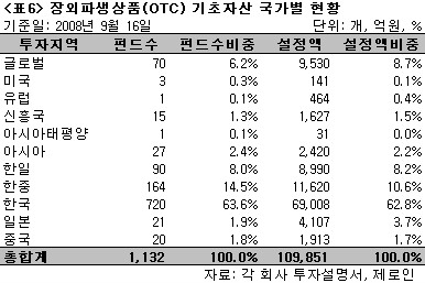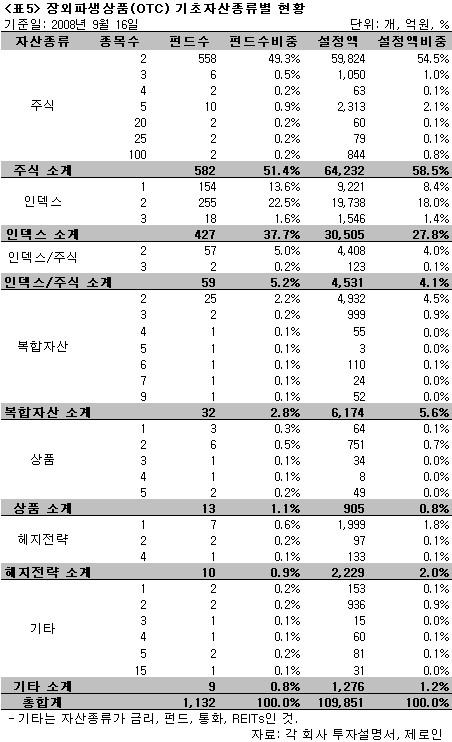 장외파생상품(OTC) 기초자산종류별 현황(<표5>)을 살펴보면, 장외파생상품을 편입한 펀드 1,132개 중 1,068개가 주식 및 주식인덱스로 구성된 장외파생상품에 투자하고 있는 것으로 나타났다. 특히 2종목의 주식자산으로 구성된 장외파생상품에 투자하는 펀드가 558개(설정액 5조 9,824억원)으로 가장 많았다. 다음으로는 2개의 주식인덱스로 구성된 상품에 투자하는 펀드로 255개(설정액 1조 9,738억원)였다. 가장 선호되는 기초자산으로는 주식의 경우는 삼성전자(128개), POSCO(120개), 한국전력(102개)이었으며, 주식인덱스의 경우는 KOSPI200(404개), HSCEI(201개), NIKKEI225(125개)였다.