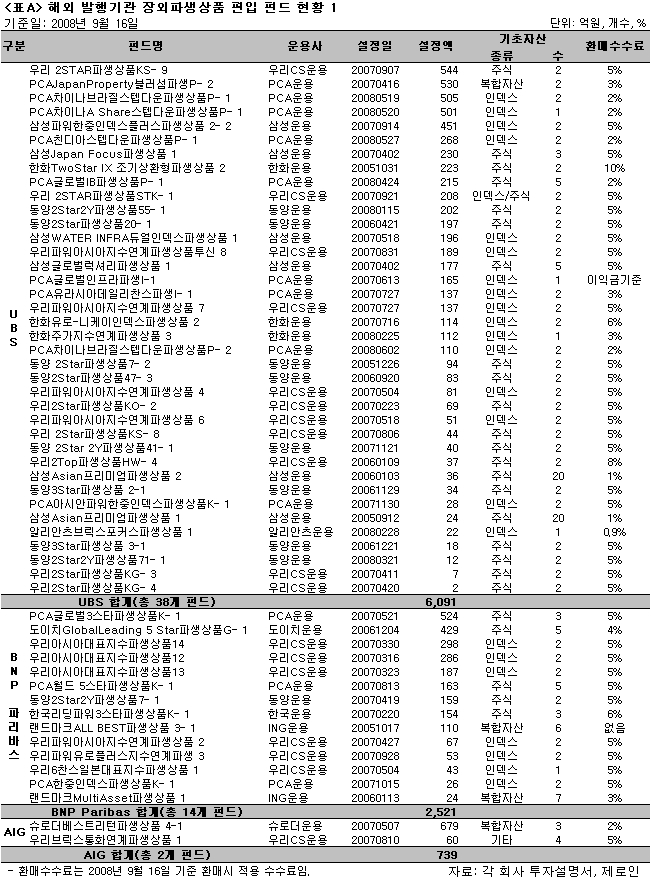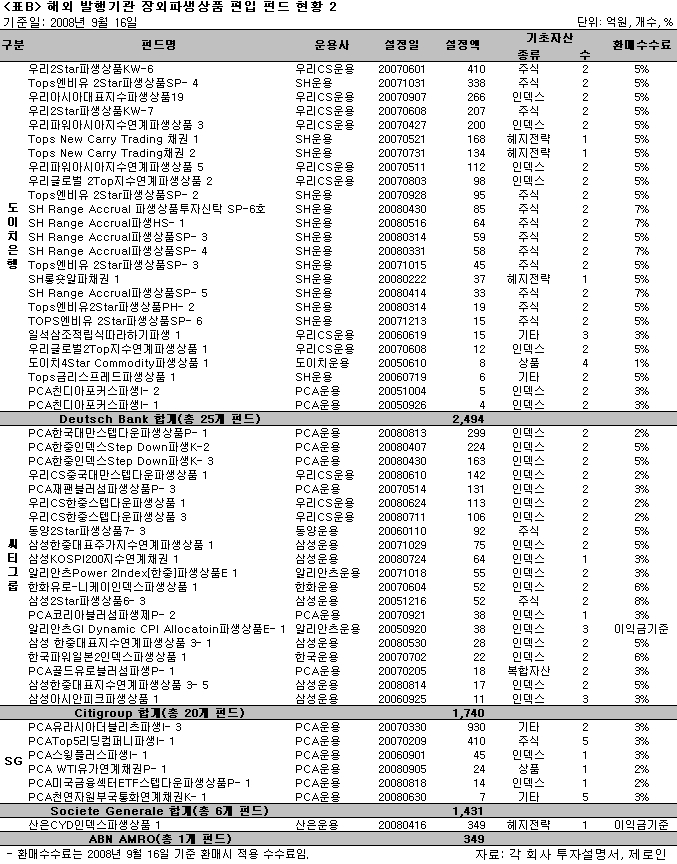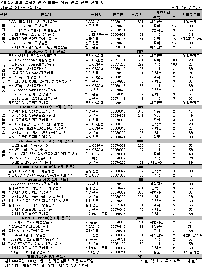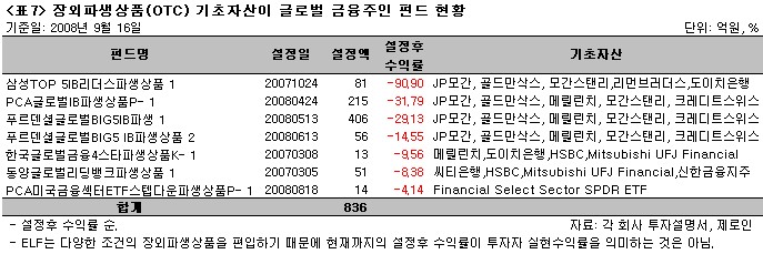 지난주에 있었던 리먼브러더스 홀딩스의 파산보호신청으로 리먼브러더스의 아시아법인이 기발행한 장외파생상품(OTC; Over The Counter)의 매각이 불가능해지자 해당 운용사들은 해당 ELF(Equity Linked Fund; <표C> 해외 발행기관 장외파생상품 편입 펀드 현황 3 참조)의 환매연기를 공시했다. 또한 해당 장외파생상품을 부실자산으로 분류하며 상각함에 따라 해당 ELF 자산의 80%~100%는 장부에서 사라진 상태다. 이는 펀드투자자에게 ELF에 기초자산 가격 변동위험 외에 또 다른 위험(발행기관 신용위험; 장외파생상품(OTC) 발행기관의 신용상태 악화에 따라 OTC의 원리금을 제때에 받지 못할 위험)이 존재함을 알렸다.