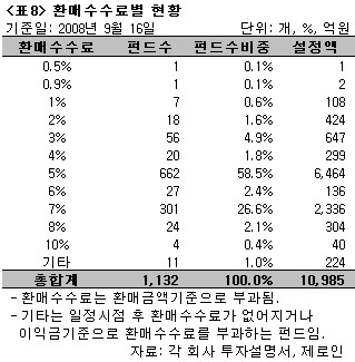 마지막으로 환매수수료별 현황(<표8>)에 따르면, 장외파생상품에 투자한 펀드를 중도 환매할 경우 투자자에게 투자 이익금 대비가 아닌 환매금액 대비 상당한 환매수수료가 부과될 수 있음을 알 수 있다. 이는 투자한 원금에 손실이 발생할 수 있음을 의미한다. 또한 중도환매 수수료가 없는 펀드에서부터 10%에 달하는 펀드까지 다양한 환매수수료가 부과되고 있었다. 662개 펀드는 5%를 환매수수료로 책정하고 있었으며, 일정시점 후 환매수수료가 없는 펀드도 2개 있었다.