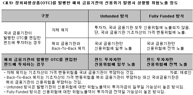 보통 장외파생상품을 편입한 펀드 투자자들은 기초자산의 가격하락위험, 시장위험, 신용위험, 중도환매 위험, 순자산가치 변동위험 등을 고려해야 한다. 신용위험은 장외파생상품을 발행한 회사의 재무상황 및 신용상태의 악화, 부도 및 파산 등의 사건으로 인해 장외파생상품의 원리금을 제때에 받지 못하는 위험을 말한다. 그러나 이번 사태로 집중 조명되고 있는 신용위험은 펀드투자자뿐만 아니라 해당 상품을 설계하는 운용사, 판매하는 판매사 입장에서도 특별한 고려상황이 아니었던 것 같다. 많은 펀드투자자들이 위험에 노출될 수 밖에 없는 이유이다.