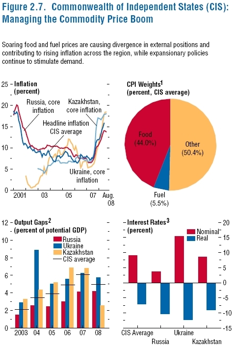 식품과 연료의 국제가격 상승이 독립국가연합 내 물가상승을 견인하고 있다. 가계소비에서 높은 비중을 차지하는 식품부문의 가격이 상승함에 따라 소비자물가상승률도 2008년 여름 15%까지 상승했다. (그림 2.7 참조) 근원인플레이션 또한 전 지역에 걸쳐 상승했다. 이는 원자재가격 상승압력과 국내 수요증가 때문으로 요약할 수 있다. 그러므로 지속적으로 잠재생산량을 초과하는 실질생산량과 노동시장의 초과수요 등 경기과열에 대한 우려가 있다. 그럼에도 불구하고 현재 독립국가연합국 정부들은 확장적 재정정책을 사용하고 있다. 현재 정부들은 정부지출을 증가시키고 실질이자율을 마이너스로 유지하고 있다. 국제 원자재가격의 상승은 원자재 순수출국들의 무역을 증가시키고 순수입국들의 무역을 감소시켰다. 아제르바이잔, 카자흐스탄, 우즈베키스탄, 투르크메니스탄, 러시아는 우호적인 교역조건을 통해 이익을 본 반면 아르메니아, 몰도바, 타지키스탄은 손해를 입었다. 몇몇 식품 순수입국의 식품재고는 위험수위에 다다랐다. 이중 키르키즈 공화국은 식품 수입 비용의 증가에 의한 지불금액 부족에 대비하여 IMF로부터 추가적인 긴급자금을 지원 받았을 정도다.