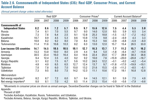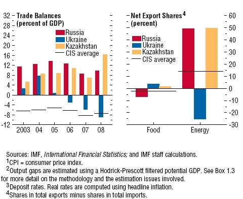 우호적인 교역조건과 기대이상의 경기부양책으로 인해 러시아의 2008년 성장은 연초 기대치보다 높은 성과를 나타낼 것으로 전망된다. 그러나 국제수요 감소와 금융상황 압박으로 성장률은 크게 감소할 전망이다. 카자흐스탄에서는 비록 아직 뜨고 있는 오일섹터에서 신용 경색의 여파를 부분적으로 상쇄시키고 있지만 예전 신용시장의 활황이 풀림에 따라 성장률이 상대적으로 낮을 것으로 기대된다. 우크라이나는 우호적인 교역조건과 풍작 등으로 미루어 볼 때 2008년 상반기까지는 강력한 성장세가 예측된다. 그러나 하반기에 이르러서는 저조한 수출, 실질임금의 상승, 교역조건의 악화, 높은 자본비용 등에 의해 성장세가 크게 둔화 될 것이다.