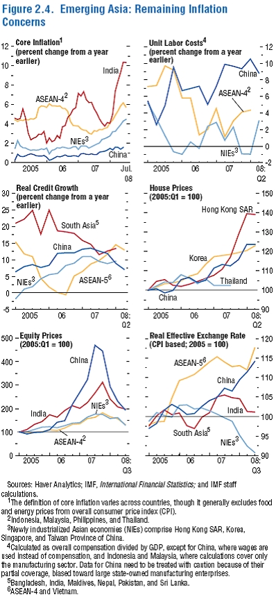 2008년 초 하락하기 시작한 아시아신흥국의 경기사이클은 선진국들의 수요둔화와 이 지역 금융시장의 어려움이 커짐에 따라 앞으로도 하락이 예상된다. 중국의 전년대비 경제성장률은 수출둔화의 영향을 받아 2008년 상반기에 10.5%로 2007년의 12%에 비해 둔화됐다. 그러나 지속적인 투자증가와 소비상승이 성장을 도왔다. 인도에서는 개인소비와 수출이 증가했으나 투자감소로 인해 2분기 성장률이 약 8%로 낮아졌다. 최근에 산업화가 이뤄진 아시아신흥공업국(NIEs)과 아세안(ASEAN) 또한 성장률이 하락했다. 식료품과 연료의 가격상승이 소비에 영향을 미치기 시작하면서 국내수요가 감소했고, 이윤하락과 수요감소로 기업들은 투자계획을 축소했다. 베트남은 대량의 자본유입으로 발생했던 수요 붐이 가라앉으면서 급격한 조정을 겪고 있다.