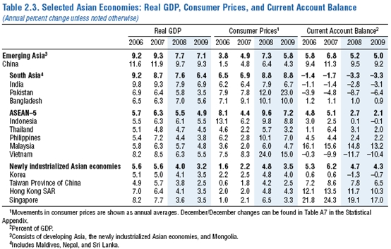 아시아신흥국의 성장률은 2007년의 9.25%에서 2008년에는 7.75% 그리고 2009년에는 7%로 소폭 하락할 것으로 예상되고 있다. (표 2.3 참조) 대외 수요감소는 수출에 영향을 미칠 것으로 전망되나 거시경제 정책들과 화폐가치 절하로 인해 충격이 상쇄될 수도 있다. 투자 또한 수출전망 악화로 인해 감소할 것이다. 지역내 공통적으로 시행한 보조금 정책이 구매력에 영향을 미칠 수도 있으나 여전히 높은 연료와 식료품 가격으로 인해 소비는 둔화될 것이다. 향후 전망에 대해서는 하락 쪽으로 기울었다. 글로벌 금융시스템의 스트레스 누적과 예상보다 심각한 글로벌 경기둔화가 경기 활성화에 영향을 줄 것으로 우려된다. 긍정적으로 보면 원자재 가격하락이 실질소득을 증가시키면서 국내수요가 예상보다 더 증가할 수도 있다.