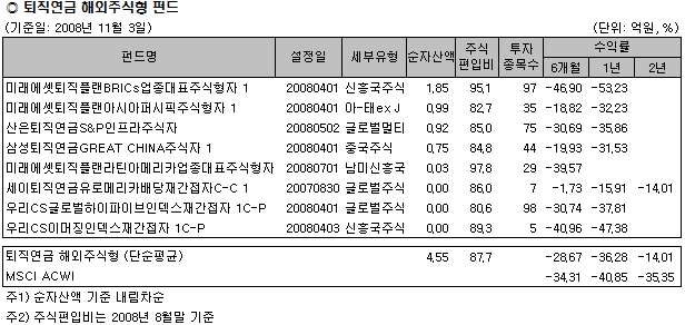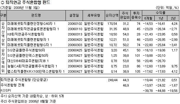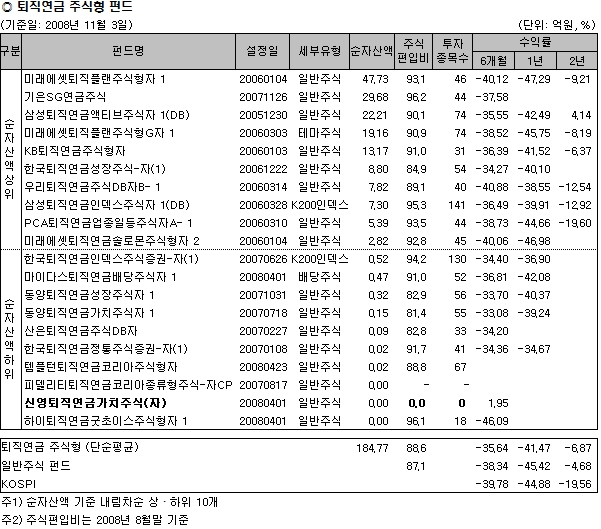 2008년 10월 말 기준 퇴직연금 주식펀드의 순자산액은 185억원으로 전체 퇴직연금 펀드 순자산액의 3.4%에 불과했다. 설정 펀드수는 29개로 이 중 순자산액이 10억원을 넘는 펀드는 4개이고, 그나마 10개 펀드는 1억원 미만이다.