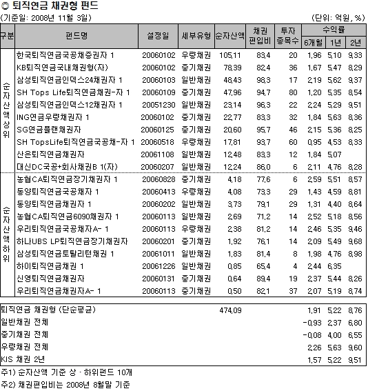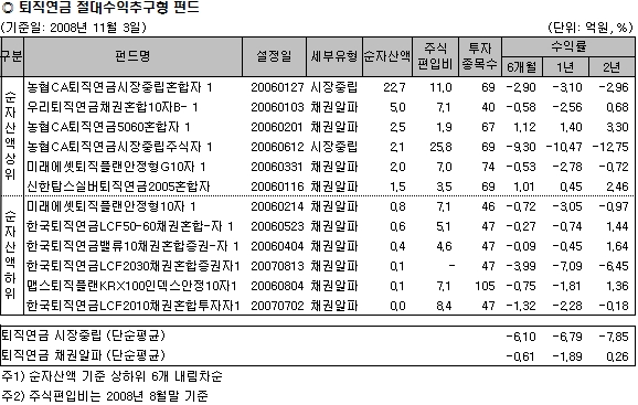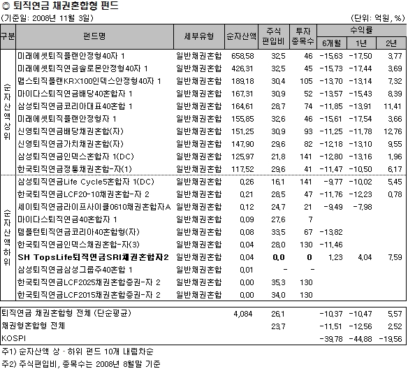 제로인이 2008년 11월 3일 기준으로 설정액 10억원이상, 운용기간 1개월 이상인 퇴직연금 펀드를 대상으로 수익률을 조사한 결과 퇴직연금 펀드에서 가장 큰 비중을 차지하고 있는 채권혼합형의 2년 평균 수익률은 3.74%를 기록하고 있는 것으로 나타났다. 이는 같은 기간 2.52%의 성과를 기록한 전체 채권혼합형 펀드에 비해 양호한 성과였다.